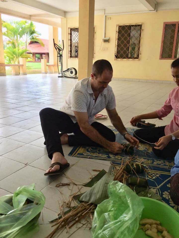 Being taught how to tie a Khmer dish of sticky rice and banana.
